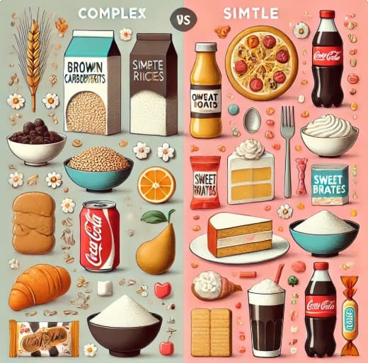 → 천천히 소화되어 혈당을 안정시킴 - 단순 탄수화물: 흰쌀밥, 설탕, 빵, 과자, 음료 등